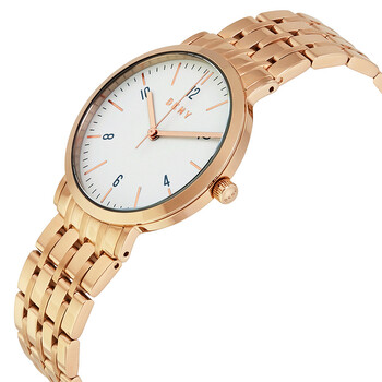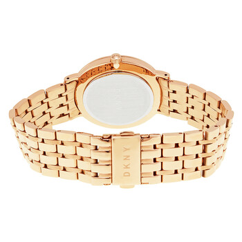 Rose gold-tone stainless steel case and bracelet. Fixed rose gold-tone bezel. White dial with rose gold-tone hands and index and Arabic numeral hour markers. Minute markers around the outer rim. Dial Type: Analog. Quartz movement. Scratch resistant mineral crystal. Pull / push crown. Solid case back. Case size: 36 mm. Case thickness: 8 mm. Round case shape. Band width: 18 mm. Deployment clasp with a push button release. Water resistant at 50 meters / 165 feet. Functions: hour, minute, second. Casual watch style. DKNY Minetta White Dial Rose Gold-tone Ladies Watch NY2504.