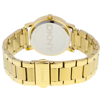 Yellow gold-tone stainless steel case and bracelet. Fixed yellow gold-tone stainless steel bezel. White dial with yellow gold-tone hands and index hour markers. Dial Type: Analog. Quartz movement. Scratch resistant mineral crystal. Pull / push crown. Solid case back. Round case shape. Case size: 34 mm. Case thickness: 9 mm. Band width: 18 mm. Fold over clasp with a push button release. Water resistant at 50 meters / 165 feet. Functions: hour, minute, second. Soho Series. Casual watch style. DKNY Soho White Dial Yellow Gold-tone Ladies Watch NY2343.