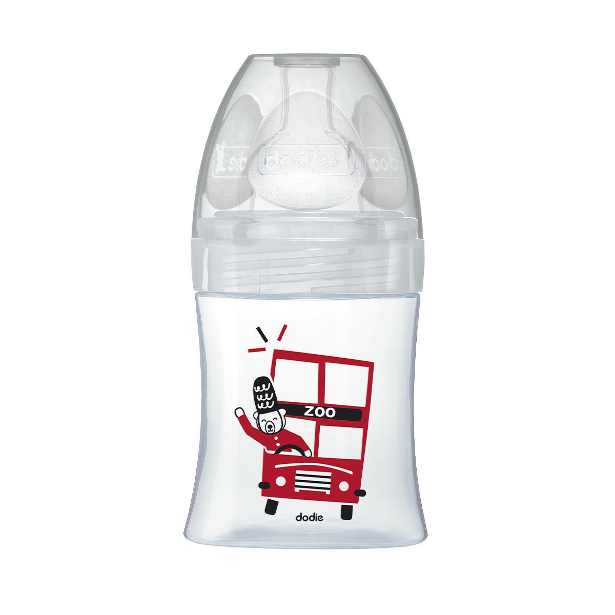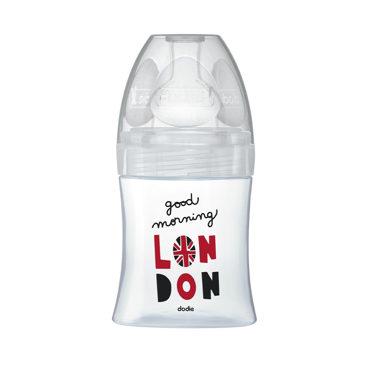 დოძიე - ანტიკოლიკური შუშის ბოთლი. Sensation+, LONDON , 0-6 თვე, ნაკადი 1, 150 მლ. ორმაგი სარქველის წყალობით უზრუნველყოფს ჰაერის ნაკადის სწორ მიწოდებას. 3 სიჩქარიანი ნაკადი უზრველყოფს ბავშვის წოვასთან მაქსიმალურ ადაპტაციას.