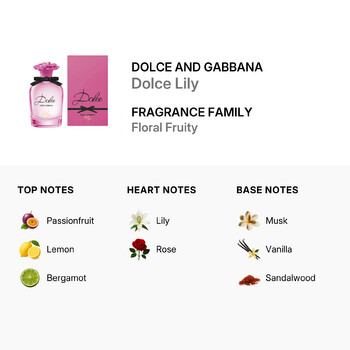 At the heart of Dolce Lily lies a delicate blend of top notes, including the zesty brightness of Passionfruit, Lemon, and Bergamot. These invigorating scents combine to awaken the senses, offering a fresh and energetic start to your day. Transitioning smoothly into the soul of the fragrance, the heart notes reveal a floral bouquet of Lily and Rose. This harmonious blend captures the essence of sophistication and femininity, making it an ideal scent for the modern woman.