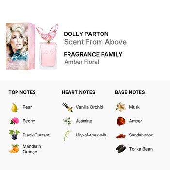 Experience the magic of country charm and timeless elegance with Dolly Parton Ladies Scent From Above EDT Spray 1.7 oz. Launched in 2021 by the legendary American icon herself, this enchanting fragrance captures the heart and soul of femininity with every spritz. Designed in the United States by the celebrity design house of Dolly Parton, this scent is a beautiful blend of warmth, sweetness, and floral sophistication.