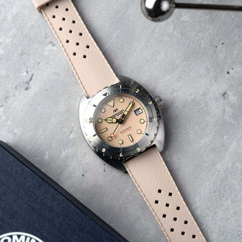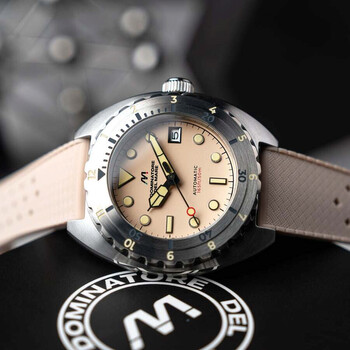 Experience the beauty of Amalfi with this masterfully crafted timepiece. inspired by the breathtaking landscape of the coastal town, this collection presents a bold cushion case shape with vibrant colour options. With Seiko NH35 automatic movement and unidirectional turning bezel, the Amalfi Automatic is energetic, stylish, and durable. Silver-tone stainless steel case with a beige silicone strap. Uni-directional rotating silver-tone stainless steel bezel. Beige dial with black hands and index hour markers. Minute markers around the outer rim. Dial Type: Analog. Luminescent hands and markers. Date display at the 3 o'clock position. Seiko - NH35 automatic movement. Scratch resistant mineral crystal. Pull / push crown. Solid case back. Round case shape, case size: 44 mm, case thickness: 14 mm. Band width: 20 mm, band length: 8 inches. Buckle clasp. Water resistant at 50 meters / 165 feet. Functions: date, hour, minute, second. Amalfi Series. Casual watch style. Dominatore Del Mare Amalfi Beige Dial Men's Watch DD-8028-09.