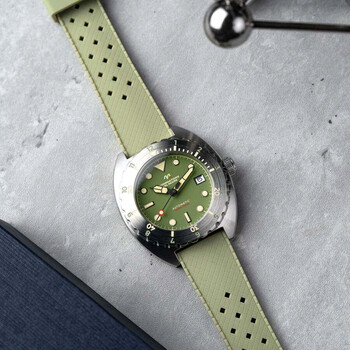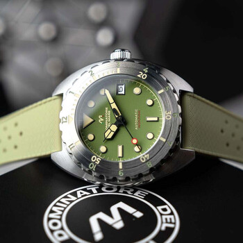 Experience the beauty of Amalfi with this masterfully crafted timepiece. inspired by the breathtaking landscape of the coastal town, this collection presents a bold cushion case shape with vibrant colour options. With Seiko NH35 automatic movement and unidirectional turning bezel, the Amalfi Automatic is energetic, stylish, and durable. Silver-tone stainless steel case with a green silicone strap. Uni-directional rotating silver-tone stainless steel bezel. Green dial with black hands and index hour markers. Minute markers around the outer rim. Dial Type: Analog. Luminescent hands and markers. Date display at the 3 o'clock position. Seiko - NH35 automatic movement. Scratch resistant mineral crystal. Pull / push crown. Solid case back. Round case shape, case size: 44 mm, case thickness: 14 mm. Band width: 20 mm, band length: 8 inches. Buckle clasp. Water resistant at 50 meters / 165 feet. Functions: date, hour, minute, second. Amalfi Series. Casual watch style. Dominatore Del Mare Amalfi Green Dial Men's Watch DD-8028-07.