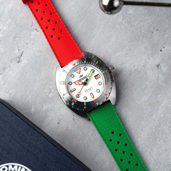 Experience the beauty of Amalfi with this masterfully crafted timepiece. inspired by the breathtaking landscape of the coastal town, this collection presents a bold cushion case shape with vibrant colour options. With Seiko NH35 automatic movement and unidirectional turning bezel, the Amalfi Automatic is energetic, stylish, and durable. Silver-tone stainless steel case with a multi-color silicone strap. Uni-directional rotating silver-tone stainless steel bezel. White dial with green hands and index hour markers. Minute markers around the outer rim. Dial Type: Analog. Luminescent hands and markers. Date display at the 3 o'clock position. Seiko - NH35 automatic movement. Scratch resistant mineral crystal. Pull / push crown. Solid case back. Round case shape, case size: 44 mm, case thickness: 14 mm. Band width: 20 mm, band length: 8 inches. Buckle clasp. Water resistant at 50 meters / 165 feet. Functions: date, hour, minute, second. Amalfi Series. Casual watch style. Dominatore Del Mare Amalfi White Dial Men's Watch DD-8028-08.