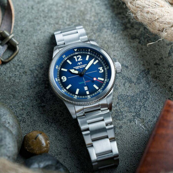 The Aviatore collection features a 42mm case diameter and a two-tone design on the dial. It boasts a versatile style and date display, making it an ideal choice for everyday wear. Showcase your sophisticated style without compromising on accuracy with this classic timepiece. Silver-tone stainless steel case and bracelet. Fixed silver-tone stainless steel bezel. Blue dial with black hands and Arabic numeral & index hour markers. Minute markers around the outer rim. Dial Type: Analog. Luminescent hands and markers. Date display at the 6 o'clock position. Seiko - VJ32 quartz movement. Pull / push crown. Solid case back. Round case shape, case size: 42 mm, case thickness: 11 mm. Band width: 20 mm, band length: 8 inches. Fold over clasp with a safety release. Water resistant at 50 meters / 165 feet. Functions: date, hour, minute, second. Aviatore Series. Casual watch style. Dominatore Del Mare Aviatore Quartz Blue Dial Men's Watch DD-8021-77.