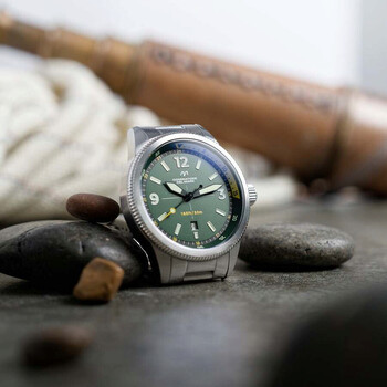 The Aviatore collection features a 42mm case diameter and a two-tone design on the dial. It boasts a versatile style and date display, making it an ideal choice for everyday wear. Showcase your sophisticated style without compromising on accuracy with this classic timepiece. Silver-tone stainless steel case and bracelet. Fixed silver-tone stainless steel bezel. Green dial with black hands and Arabic numeral & index hour markers. Minute markers around the outer rim. Dial Type: Analog. Luminescent hands and markers. Date display at the 6 o'clock position. Seiko - VJ32 quartz movement. Pull / push crown. Solid case back. Round case shape, case size: 42 mm, case thickness: 11 mm. Band width: 20 mm, band length: 8 inches. Fold over clasp with a safety release. Water resistant at 50 meters / 165 feet. Functions: date, hour, minute, second. Aviatore Series. Casual watch style. Dominatore Del Mare Aviatore Quartz Green Dial Men's Watch DD-8021-55.