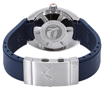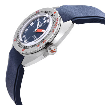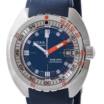 Silver-tone stainless steel case with a blue rubber strap. Uni-directional rotating silver-tone bezel. Blue dial with white and orange hands and index hour markers. Dial Type: Analog. Luminescent hands and markers. Date display at the 3 o'clock position. ETA Caliber 2824-2 Automatic movement, based upon ETA 2824, containing 25 Jewels, bitting at 28800 vph, and has a power reserve of approximately 38 hours. Scratch resistant sapphire crystal. Screw down crown. Round case shape, case size: 42 mm. Buckle clasp. Water resistant at 300meters / 1000 feet. Functions: date, hour, minute, second. Caribbean Series. Dive watch style. Watch label: Swiss Movt. Doxa Caribbean Automatic Blue Dial Men's Watch 821.10.201.32.