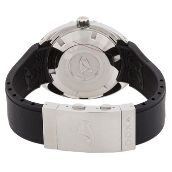 Silver-tone stainless steel case with a black rubber strap. Uni-directional rotating silver-tone stainless steel bezel. Silver dial with black and red hands and index hour markers. Minute markers around the outer rim. Dial Type: Analog. Luminescent hands and markers. Date display at the 3 o'clock position. Automatic movement with a 50-hour power reserve. Scratch resistant sapphire crystal. Screw down crown. Solid case back. Cushion case shape, case size: 45 mm. Folding clasp. Water resistant at 1500 meters / 5000 feet. Functions: date, hour, minute, second. Sub 1500t Searambler Series. Dive watch style. Watch label: Swiss Made. Doxa Sub 1500T Searambler Automatic Silver Dial Men's Watch 883.10.021.20.