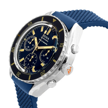Silver-tone stainless steel case with a blue rubber strap. Uni-directional rotating blue bezel. Blue dial with silver-tone hands and index hour markers. Minute markers around the outer rim. Dial Type: Analog. Luminescent hands and markers. Chronograph - sub-dials displaying: 12 hours, 30 minutes, 60 seconds. Automatic movement. Scratch resistant sapphire crystal. Solid case back. Round case shape, case size: 45 mm. Water resistant at 200 meters / 660 feet. Functions: chronograph, hour, minute, second. Sub 200 C-graph Caribbean Series. Watch label: Swiss Made. Doxa Sub 200 C-Graph Caribbean Chronograph Automatic Blue Dial Men's Watch 798.10.201.32.