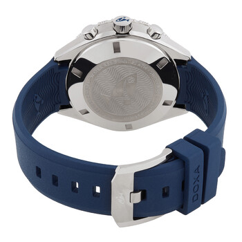 Silver-tone stainless steel case with a blue leather strap. Uni-directional rotating blue ceramic bezel. Blue dial with silver-tone hands and index hour markers. Minute markers around the outer rim. Dial Type: Analog. Luminescent hands and markers. Chronograph - three sub-dials displaying: 60 second, 30 minute and 12 hour. Automatic movement with a 56-hour power reserve. Scratch resistant sapphire crystal. Screw down crown. Solid case back. Round case shape, case size: 42 mm. Buckle clasp. Water resistant at 200 meters / 660 feet. Functions: chronograph, hour, minute, second. Sub 200 C-graph II Series. Sport watch style. Watch label: Swiss Made. Doxa SUB 200 C-Graph II Chronograph Automatic Blue Dial Men's Watch 797.10.201.32.