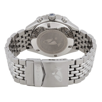 Silver-tone stainless steel case and bracelet. Uni-directional rotating blue ceramic bezel. Bue dial with silver-tone hands and index hour markers. Minute markers around the outer rim. Dial Type: Analog. Luminescent hands and markers. Chronograph - three sub-dials displaying: 60 second, 30 minute and 12 hour. Automatic movement with a 56-hour power reserve. Scratch resistant sapphire crystal. Screw down crown. Solid case back. Round case shape, case size: 42 mm. Fold over clasp with a safety release. Water resistant at 200 meters / 660 feet. Functions: chronograph, hour, minute, second. Sub 200 C-graph II Series. Sport watch style. Watch label: Swiss Made. Doxa SUB 200 C-Graph II Chronograph Automatic Men's Watch 797.10.201.10.