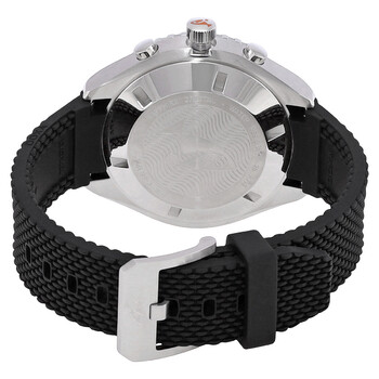 Silver-tone stainless steel case with a black rubber strap. Uni-directional rotating black bezel. Silver dial with silver-tone hands and index hour markers. Minute markers around the outer rim. Dial Type: Analog. Luminescent hands and markers. Chronograph - sub-dials displaying: 12 hours, 30 minutes, 60 seconds. Automatic movement. Scratch resistant sapphire crystal. Round case shape, case size: 45 mm. Water resistant at 200 meters / 660 feet. Functions: chronograph, hour, minute, second. Watch label: Swiss Made. Doxa Chronograph Automatic Silver Dial Men's Watch 798.10.021.20.