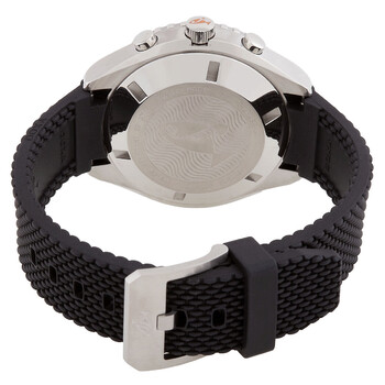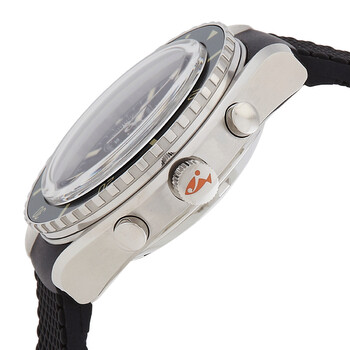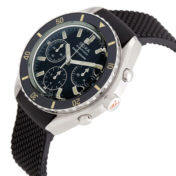 Silver-tone stainless steel case with a black rubber strap. Uni-directional rotating black bezel. Black dial with silver-tone hands and index hour markers. Minute markers around the outer rim. Dial Type: Analog. Luminescent hands and markers. Chronograph - three sub-dials displaying: 60 second, 30 minute and 1/10th of a second. Automatic movement. Scratch resistant sapphire crystal. Round case shape, case size: 45 mm. Buckle clasp. Water resistant at 200 meters / 660 feet. Functions: chronograph, hour, minute, second. Sub 200 C-graph Sharkhunter Series. Watch label: Swiss Made. Doxa SUB 200 C-Graph Sharkhunter Chronograph Automatic Black Dial Men's Watch 798.10.101.20.