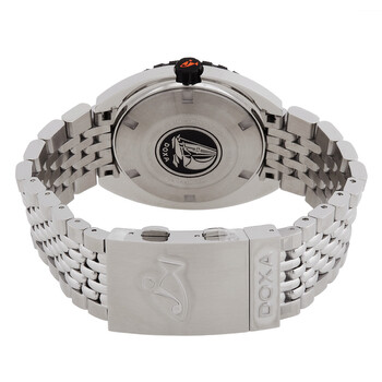 Silver-tone stainless steel case and bracelet. Uni-directional rotating black ceramic bezel. Silver dial with luminous hands and index hour markers. Minute markers around the outer rim. Dial Type: Analog. Luminescent hands and markers. Date display at the 3 o'clock position. ETA Caliber 2824-2 Automatic movement, based upon ETA 2824, containing 25 Jewels, bitting at 28800 vph, and has a power reserve of approximately 38 hours. Scratch resistant sapphire crystal. Screw down crown. Solid case back. Round case shape, case size: 42.50 x 44.5mm. Folding clasp. Water resistant at 300 meters / 1000 feet. Functions: date, hour, minute, second. Sub 300ß Searambler Series. Sport watch style. Watch label: Swiss Made. Doxa SUB 300ß Searambler Automatic Silver Dial Men's Watch 830.10.021.10.