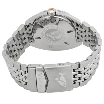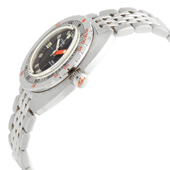 Silver-tone stainless steel case and bracelet. Uni-directional rotating silver-tone bezel. Black dial with white and orange hands and index hour markers. Minute markers around the outer rim. Dial Type: Analog. Luminescent hands and markers. Date display at the 3 o'clock position. ETA Caliber 2824-2 Automatic movement, based upon ETA 2824, containing 25 Jewels, bitting at 28800 vph, and has a power reserve of approximately 38 hours. Screw down crown. Solid case back. Round case shape, case size: 42 mm. Water resistant at 300 meters/ 1000 feet. Functions: date, hour, minute, second. Sub 300 Sharkhunter Series. Dive watch style. Watch label: Swiss Movt. Doxa SUB 300 Sharkhunter Automatic Black Dial Men's Watch 821.10.101.10.
