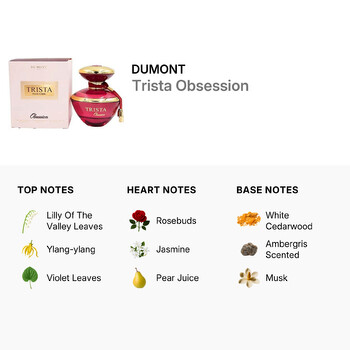 Trista Obsession is more than just a perfume; it's a statement of elegance and style. It's a reflection of the modern woman who is confident, sophisticated, and not afraid to express her individuality. With its unique scent profile and stunning bottle design, this perfume truly embodies the spirit of the Dumont brand. Experience the luxurious world of Dumont fragrances with Trista Obsession EDP 3.4 oz.