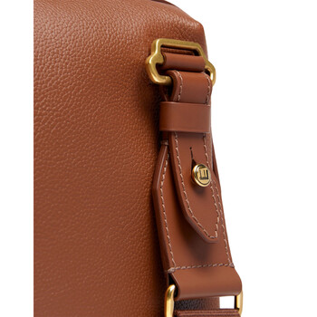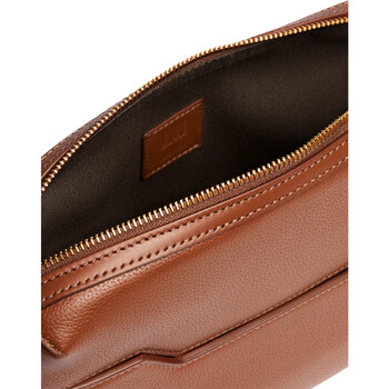 Dunhill Men's Messenger. SKU: DU23R3102GN251. Color: Tobacco. Size: 24cm x 16.5cm x 5cm. This messenger bag features a detachable, adjustable shoulder strap, a main zipped compartment, a flat front pocket, a strap handle on the base, palladium-plated hardware, and Dunhill blind-embossed branding. 100% calf leather. Made In Italy.