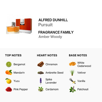Dunhill Pursuit opens with an energizing blend of fresh bergamot, juicy mandarin, exotic yuzu, and a touch of spicy pink pepper. These top notes awaken the senses and set the tone for a dynamic experience. At its heart, warm cinnamon, musky ambrette seed, aromatic spike lavender, and spicy cardamom create a rich, inviting scent that’s both confident and comforting.