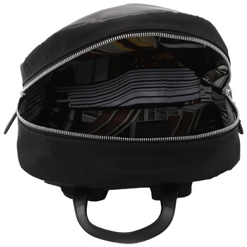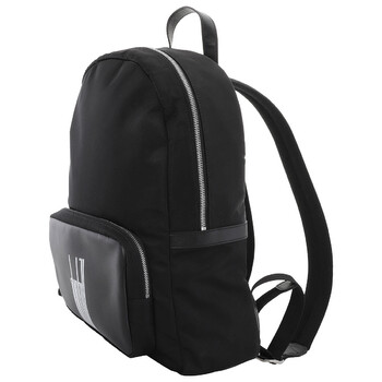 Dunhill Men's Backpack. Barcode: 5057464738043. Color: Black. The Dunhill x Kenta Cobayashi Backpack blends sleek design with functional luxury. It features padded adjustable straps with refined leather accents and a convenient top carry handle for versatile carrying options. The backpack is designed with branded silver-tonal hardware and leather zip pulls, as well as an external zipped pocket for easy access to essentials. Inside, it’s lined with technical fabric printed with Kenta Cobayashis digital manipulation of a 1970s Dunhill catalogue cover. Made in Italy.