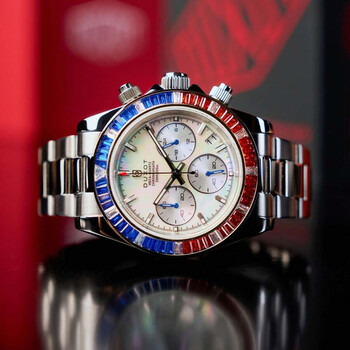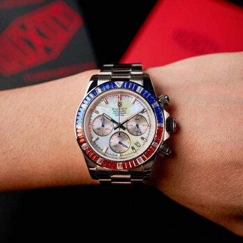 Step into modern elegance with the Accelero Rainbow Chronograph. Powered by a chronograph movement and featuring a sleek 40mm case, this watch is the epitome of refined style. The anti-reflective sapphire lens offers durability and clarity, making it a must-have for your collection. Discover the perfect blend of sophistication and performance today. Silver-tone stainless steel case and bracelet. Fixed stainless steel bezel. White dial with silver-tone hands and index hour markers. Minute markers around the outer rim. Dial Type: Analog. Date display between 4 and 5 o'clock position. Chronograph - three sub-dials displaying: 60 second, 60 minute and 24 hour. Shiojiri Caliber VK63 quartz movement. Scratch resistant sapphire crystal. Screw down crown. Solid case back. Round case shape, case size: 40 mm, case thickness: 12 mm. Band width: 20 mm, band length: 8 inches. Fold over clasp with a safety release. Water resistant at 100 meters / 330 feet. Functions: chronograph, date, hour, minute, second. Accelero Rainbow Series. Casual watch style. Duxot Accelero Rainbow Chronograph Quartz White Dial Men's Watch DX-2064-11.