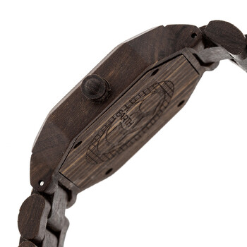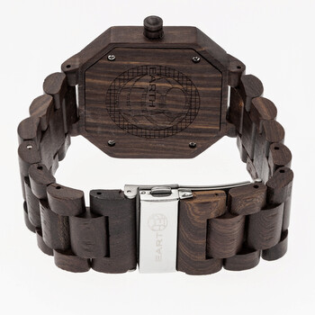 Dark brown wood case with a dark brown wood bracelet. Fixed dark brown bezel. Dark brown dial with silver-tone arrow-shaped hands and index hour markers. Dial Type: Analog. Luminescent hands. One - 60 second subdial. Quartz movement. Scratch resistant mineral crystal. Solid case back. Octagon case shape, case size: 43 mm, case thickness: 10 mm. Band width: 25 mm. Push button deployment clasp. Functions: hour, minute, small second. Dress watch style. Watch label: Japan Movt. Earth Acadia Octagon Watch ETHEW4702.
