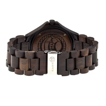Eco-friendly dark brown wood case with a dark brown wood bracelet. Fixed dark brown wood bezel. Dark brown dial with silver-tone hands and dot hour markers. Arabic numerals mark the 6, 9 and 12 o'clock positions. Dial Type: Analog. Luminescent hands and markers. Date display at the 3 o'clock position. Quartz movement. Scratch resistant mineral crystal. Solid case back. Case diameter: 47 mm. Case thickness: 13 mm. Round case shape. Band width: 25 mm. Deployment clasp with push button release. No water resistance. Functions: date, hour, minute, second. Casual watch style. Earth Eco-Friendly Dark Brown Wood Raywood Watch EW1702.