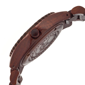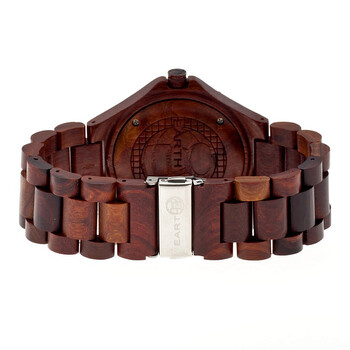 Eco-friendly red wood case with a red wood bracelet. Fixed red wood bezel. Red dial with silver-tone hands and dot hour markers. Arabic numerals mark the 6, 9 and 12 o'clock positions. Dial Type: Analog. Luminescent hands and markers. Date display at the 3 o'clock position. Quartz movement. Scratch resistant mineral crystal. Protected crown. Solid case back. Case diameter: 47 mm. Case thickness: 13 mm. Round case shape. Band width: 25 mm. Deployment clasp with push button release. No water resistance. Functions: date, hour, minute, second. Casual watch style. Earth Eco-Friendly Dark Brown Wood Raywood Watch EW1703.