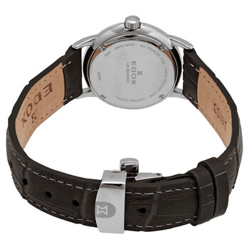 Stainless steel case with a black leather strap. Fixed stainless steel bezel. Black dial with silver-tone hands and index hour markers. Minute markers around the outer rim. Dial Type: Analog. Date display above the 6 o'clock position. Quartz movement. Scratch resistant sapphire crystal. Pull / push crown. Solid case back. Round case shape. Case size: 28 mm. Case thickness: 6 mm. Band width: 15 mm. Fold over clasp with a push button release. Water resistant at 30 meters / 100 feet. Functions: date, hour, minute, second. Les Bemonts Series. Dress watch style. Watch label: Swiss Made. Edox Les Bemonts Black Dial Black Leather Ladies Watch 57001 3 GIN.