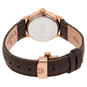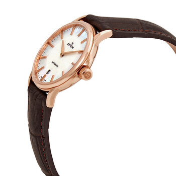 Rose gold-tone stainless steel case with a black leather strap. Fixed rose gold-tone bezel. Mother of pearl dial with rose gold-tone hands and index hour markers. Minute markers around the outer rim. Dial Type: Analog. Date display above the 6 o'clock position. Quartz movement. Scratch resistant sapphire crystal. Pull / push crown. Solid case back. Round case shape. Case size: 28 mm. Case thickness: 6 mm. Band width: 16 mm. Fold over clasp. Water resistant at 30 meters / 100 feet. Functions: date, hour, minute, second. Les Bemonts Series. Dress watch style. Watch label: Swiss Made. Edox Les Bemonts Mother of Pearl Dial Ladies Watch 57001 37R NAIR.