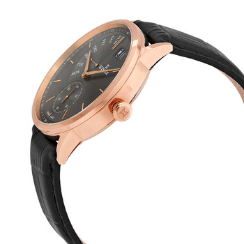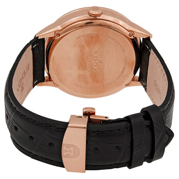 Rose gold-tone stainless steel case with a black leather strap. Fixed rose gold-tone bezel. Black dial with rose gold-tone hands and index hour markers. Arabic numeral minute markers (at 5 minute intervals). Minute markers around the outer rim. Dial Type: Analog. Date display at the 2 o'clock position. Small seconds sub-dial. Retrograde day of the week display. Sellita SW200-1 quartz movement. Scratch resistant sapphire crystal. Pull / push crown. Solid case back. Round case shape. Case size: 42 mm. Case thickness: 11.2 mm. Band width: 20 mm. Deployment clasp with a push button release. Water resistant at 50 meters / 165 feet. Functions: date, day, hour, minute, second. Les Vauberts Series. Casual watch style. Watch label: Swiss Made. Edox Quartz Black Dial Black Leather Men's Watch 34500 37R GIR.