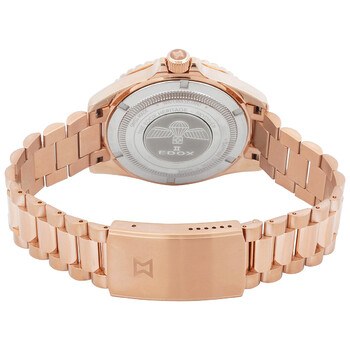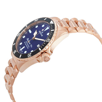Rose gold PVD stainless steel case and bracelet. Uni-directional rotating black bezel. Blue dial with rose gold-tone hands and dots, sticks hour markers. Minute markers around the outer rim. Dial Type: Analog. Luminescent hands and markers. Date display at the 3 o'clock position. Edox Calibre Cal. 80 automatic movement with a 40-hour power reserve. Scratch resistant sapphire crystal. Screw down crown. Solid case back. Round case shape, case size: 42 mm, case thickness: 13 mm. Folding clasp. Water resistant at 300 meters / 1000 feet. Functions: date, hour, minute, second. Skydiver 70s Date Series. Dive watch style. Watch label: Swiss Made. Edox Skydiver 70s Date Automatic Blue Dial Men's Watch 80112 37RNM BUI.