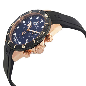 Rose gold-tone stainless steel case with a black rubber strap. Uni-directional rotating black stainless steel bezel. Blue dial with rose gold-tone hands and index hour markers. Minute markers around the outer rim. Dial Type: Analog. Luminescent hands and markers. Date display at the 4 o'clock position. Chronograph - three sub-dials displaying: 60 second, 30 minute and 12 hour. Quartz movement. Scratch resistant sapphire crystal. Screw down crown. Solid case back. Round case shape, case size: 44 mm, case thickness: 12 mm. Band width: 22 mm. Buckle clasp. Water resistant at 300 meters / 1000 feet. Functions: chronograph, date, hour, minute, second. Skydiver Series. Dive watch style. Watch label: Swiss Made. Edox Skydiver Chronograph Quartz Blue Dial Men's Watch 10238 37RNNCA BUI.