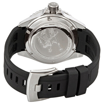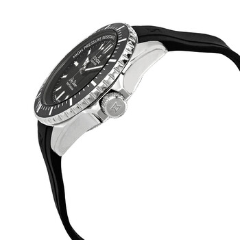 Stainless steel case with a black rubber strap. Uni-directional rotating stainless steel bezel with an inlaid black ceramic ring. Black dial with silver-tone hands and index hour markers. Minute markers around the outer rim. Dial Type: Analog. Luminescent hands and markers. Date display at the 3 o'clock position. Caliber ETA 2824-2 automatic movement with a 38-hour power reserve. Scratch resistant sapphire crystal. Screw down crown. Solid case back. Round case shape. Case size: 44 mm. Case thickness: 16 mm. Band width: 22 mm. Tang clasp. Water resistant at 1000 meters / 3300 feet. Functions: date, hour, minute, second. Skydiver Neptunian Series. Dive watch style. Watch label: Swiss Made. Edox Skydiver Neptunian Automatic Black Dial Men's Watch 80120 3NCA NIN.