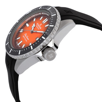 Silver-tone stainless steel case with a black rubber strap. Uni-directional rotating black ceramic bezel. Orange dial with silver-tone hands and index hour markers. Minute markers around the outer rim. Dial Type: Analog. Luminescent hands and markers. Date display at the 3 o'clock position. Automatic movement. Scratch resistant sapphire crystal. Screw down crown. Round case shape, case size: 44 mm. Buckle clasp. Water resistant at 1000 meters / 3300 feet. Functions: date, hour, minute, second. Skydiver Neptunian Series. Dive watch style. Watch label: Swiss Made. Edox Skydiver Neptunian Automatic Orange Dial Men's Watch 80120 3NCA ODN.