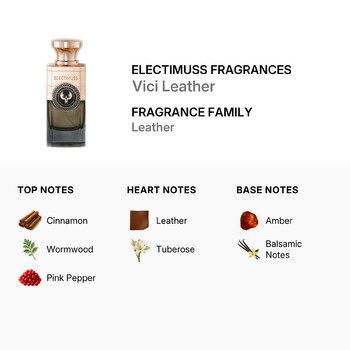 Discover bold sophistication with Electimuss Fragrances' Vici Leather Parfum Spray. Launched in 2022, this unisex fragrance is a standout creation from the prestigious UK-based niche perfume house, known for crafting luxurious, high-performance scents. Designed for those who crave distinction, Vici Leather is a dynamic blend that captures strength, style, and mystery in every spritz.