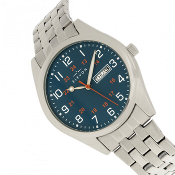 Silver-tone alloy case with a silver-tone alloy bracelet. Fixed silver-tone alloy bezel. Teal dial with silver-tone hands and Arabic numeral hour markers. Minute markers around the outer rim. Dial Type: Analog. Luminescent hands and markers. Day of the week and date display at the 3 o'clock position. Quartz movement. Scratch resistant mineral crystal. Pull / push crown. Solid case back. Tonneau case shape, case size: 41 mm, case thickness: 9 mm. Band width: 21 mm. Push button deployment clasp. Water resistant at 50 meters / 165 feet. Functions: date, day, hour, minute, second. Casual watch style. Watch label: Japan Movt. Item Variations: ELE106-3. Elevon Gann Men's Watch ELE106-3.