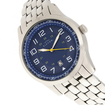 Silver-tone alloy case with a silver-tone alloy bracelet. Fixed silver-tone alloy bezel. Blue dial with luminous silver-tone hands and Arabic numeral hour markers. Arabic numeral minute markers (at 5 minute intervals). Minute markers around the outer rim. Dial Type: Analog. Luminescent hands. Date display above the 6 o'clock position. Quartz movement. Scratch resistant mineral crystal. Pull / push crown. Solid case back. Round case shape. Case size: 42 mm. Case thickness: 10 mm. Band width: 22 mm. Fold over push button deployment clasp. Water resistant at 50 meters / 165 feet. Functions: date, hour, minute, second. Garrison Series. Casual watch style. Watch label: Japan Movt. Item Variations: ELE105-4. Elevon Garrison Blue Dial Men's Watch ELE105-4.