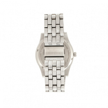 Silver-tone alloy case with a silver-tone alloy bracelet. Fixed silver-tone alloy bezel. Green dial with silver-tone hands and Arabic numeral hour markers. Minute markers around the outer rim. Dial Type: Analog. Luminescent hands. Date display at the 6 o'clock position. Quartz movement. Scratch resistant mineral crystal. Pull / push crown. Solid case back. Round case shape, case size: 42 mm, case thickness: 10 mm. Band width: 22 mm. Fold over push button deployment clasp. Water resistant at 50 meters / 165 feet. Functions: date, hour, minute, second. Casual watch style. Watch label: Japan Movt. Item Variations: ELE105-3. Elevon Garrison Green Dial Men's Watch ELE105-3.