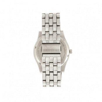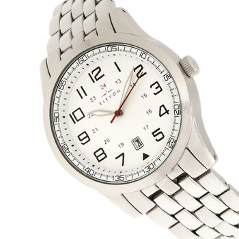 Silver-tone alloy case with a silver-tone alloy bracelet. Fixed silver-tone alloy bezel. White dial with luminous silver-tone hands and Arabic numeral hour markers. Arabic numeral minute markers (at 5 minute intervals). Minute markers around the outer rim. Dial Type: Analog. Luminescent hands. Date display at the 6 o'clock position. Quartz movement. Scratch resistant mineral crystal. Pull / push crown. Solid case back. Round case shape. Case size: 42 mm. Case thickness: 10 mm. Band width: 22 mm. Fold over push button clasp. Water resistant at 50 meters / 165 feet. Functions: date, hour, minute, second. Casual watch style. Watch label: Japan Movt. Item Variations: ELE105-1. Elevon Garrison White Dial Men's Watch ELE105-1.