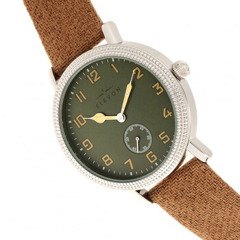 Silver-tone alloy case with a camel genuine leather strap. Fixed silver-tone alloy bezel. Green dial with silver-tone hands and Arabic numeral hour markers. Minute markers around the outer rim. Dial Type: Analog. Luminescent hands. One - small second subdial. Quartz movement. Scratch resistant mineral crystal. Pull / push crown. Solid case back. Round case shape, case size: 42 mm, case thickness: 11 mm. Band width: 20 mm. Buckle clasp. Water resistant at 50 meters / 165 feet. Functions: hour, minute, small second. Casual watch style. Watch label: Japan Movt. Item Variations: ELE110-5. Elevon Northrop Green Dial Men's Watch ELE110-5.