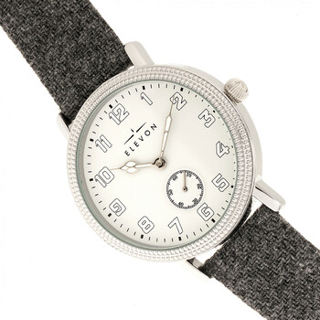 Silver-tone alloy case with a grey genuine leather strap. Fixed silver-tone alloy bezel. White dial with silver-tone cathedral-style hands and Arabic numeral hour markers. Minute markers around the outer rim. Dial Type: Analog. Luminescent hands. One - small second subdial. Quartz movement. Scratch resistant mineral crystal. Pull / push crown. Solid case back. Round case shape, case size: 42 mm, case thickness: 11 mm. Band width: 20 mm. Buckle clasp. Water resistant at 50 meters / 165 feet. Functions: hour, minute, small second. Casual watch style. Watch label: Japan Movt. Item Variations: ELE110-1. Elevon Northrop White Dial Men's Watch ELE110-1.
