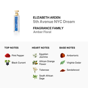 At first spray, 5th Avenue NYC Dream awakens your senses with a lively burst of pink pepper and juicy black currant. The heart blooms with an exotic bouquet of Egyptian jasmine, African orange flower, tuberose, and a unique touch of South African sage—creating a floral harmony that’s both bold and graceful. As it dries down, warm base notes of ambertonic, creamy sandalwood, and Virginia cedar leave a smooth, lasting impression that feels effortlessly chic.