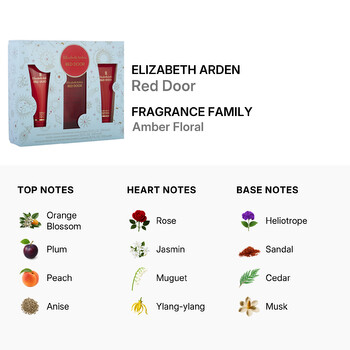 Launch year: 1989. Fragrance Family: Amber Floral. Top notes: Orange blossom, Plum, Peach, Anise. Heart notes: Rose, Jasmin, Muguet, Ylang-ylang, Orris, Honey. Base notes: Heliotrope, Sandal, Cedar, Musk, Amber, Benzoin. Design house: Elizabeth Arden. Design house country: United States. Scent name: Red Door. Gender: Ladies. Category: Fragrance. SubType: Gift Set. Barcode: 085805374914. EDT 3.3oz, B\L 3.3oz, Body Powder 3.3oz. Elizabeth Arden Ladies Red Door Gift Set Fragrances 085805374914.