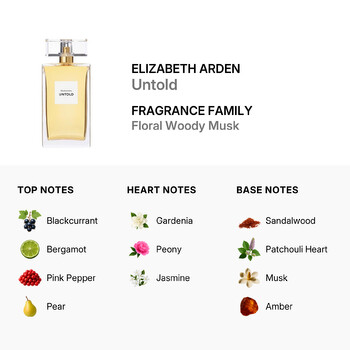 Untold opens with a sparkling burst of blackcurrant, bergamot, pink pepper, and juicy pear—setting a vibrant and playful tone. As the scent unfolds, a heart of gardenia, peony, and jasmine adds a graceful floral touch that feels soft yet powerful. The base notes of sandalwood, patchouli heart, musk, and amber create a warm, lasting impression that feels both mysterious and unforgettable.