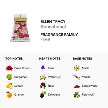 The base notes create a warm and sensual finish with a rich blend of musk, creamy vanilla, smooth sandalwood, and earthy patchouli. These deeper tones give the fragrance lasting power and a comforting presence that stays with you from morning to night. Whether you're heading to a special event or just enjoying a casual day out, Ellen Tracy Sensational adds a touch of elegance to every moment.
