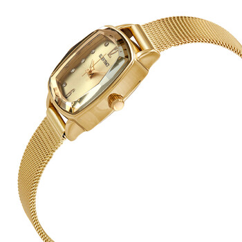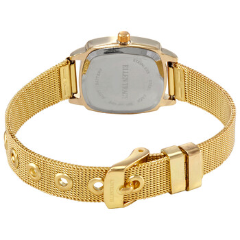 Gold-tone stainless steel case with a gold-tone stainless steel mesh bracelet. Fixed gold-tone bezel. Gold dial with gold-tone hands and rhinestone hour markers. Arabic numerals appear at the 6 and 12 o'clock positions. Dial Type: Analog. Quartz movement. Scratch resistant mineral crystal. Pull / push crown. Solid case back. Rectangle case shape. Case dimensions: 23 mm x 30 mm. Tang clasp. Water resistant at 10 meters / 30 feet. Functions: hour, minute, second. Dress watch style. Ellen Tracy Quartz Crystal Gold Dial Ladies Watch ET5188GD.