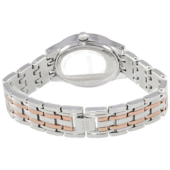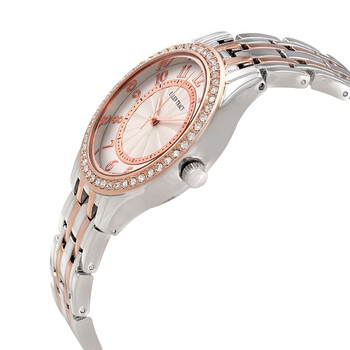 Silver-tone metal case with a two-tone (silver-tone and rose gold-tone) metal bracelet. Fixed rose gold-tone metal bezel set with crystal set. White dial with rose gold-tone hands and Arabic numeral hour markers. Minute markers around an inner ring. Dial Type: Analog. Quartz movement. Pull / push crown. Solid case back. Round case shape. Case size: 33 mm. Fold over clasp with a safety release. Water resistant at 30 meters / 100 feet. Functions: hour, minute, second. Dress watch style. Ellen Tracy Quartz Crystal Two-tone Ladies Watch ET5315TTRG.