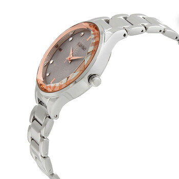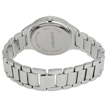 Stainless steel case with a silver-tone alloy bracelet. Fixed stainless steel bezel with an inlaid rose gold-tone faceted ring. Grey dial with rose gold-tone hands and crystal hour markers. Index markers at the 3, 6, 9 amd 12 o'clock positions. Dial Type: Analog. Quartz movement. Scratch resistant mineral crystal. Pull / push crown. Solid case back. Round case shape. Case size: 35.5 mm. Water resistant at 30 meters / 100 feet. Functions: hour, minute, second. Dress watch style. Watch label: Japan Movt. Ellen Tracy Quartz Grey Dial Ladies Watch ET5313SL.