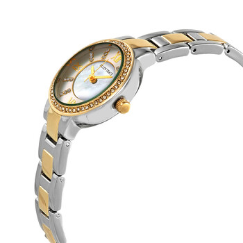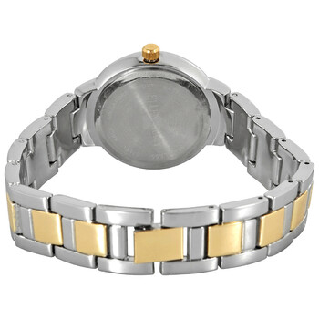 Silver-tone metal case with a two-tone (silver-tone and yellow gold-tone) alloy bracelet. Fixed yellow gold-tone metal bezel. Tonal dial with yellow gold-tone hands and crystal-set index hour markers. Roman numerals appear at the 3, 6, 9 and 12 o'cllock positions. Dial Type: Analog. Quartz movement. Scratch resistant mineral crystal. Pull / push crown. Solid case back. Round case shape. Case size: 35.5 mm. Band width: 12 mm. Fold over clasp. Water resistant at 30 meters / 100 feet. Functions: hour, minute, second. Dress watch style. Watch label: Japan Movt. Ellen Tracy Quartz Ladies Watch ET5189TTG.