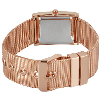 Rose gold-tone stainless steel case with a rose gold-tone alloy mesh bracelet. Fixed rose gold-tone bezel. Silver dial with rose gold-tone hands and index hour markers. Crystal-set index markers appear at the 6 and 12 o'clock positions. Dial Type: Analog. Quartz movement. Scratch resistant mineral crystal. Pull / push crown. Solid case back. Rectangle case shape. Case size: 35.5 mm. Band width: 18 mm. Tang clasp. Water resistant at splash resistant. Functions: hour, minute, second. Dress watch style. Watch label: Japan Movt. Ellen Tracy Quartz Ladies Watch ET5254RG.